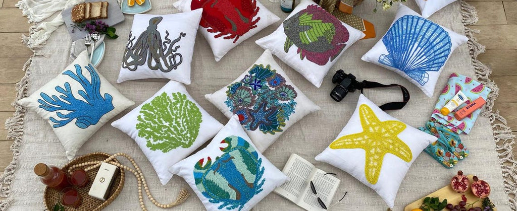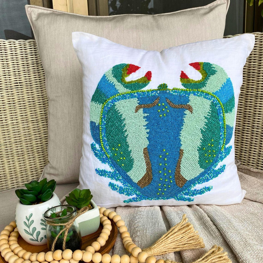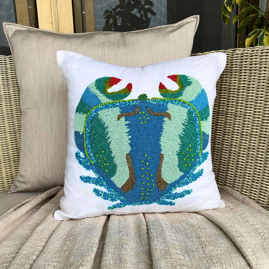 Crab Craze is an exclusive 100% handmade decorative throw cushion cover designed and created with intrinsic detailing. A perfect item to decorate your living room, bedroom, office, couch, chair, sofa or bed.