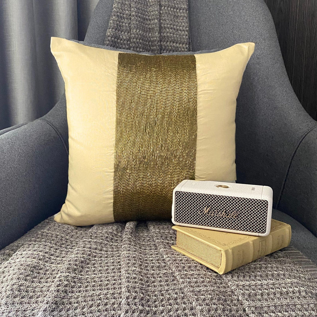 Fabric: Art Silk Material Used: Bead Fabric Color: Gold Pattern: Striped Style: Modern Back of the cover: Plain Gold Art Silk Fabric For Insert Removal: Concealed flap covered zipper on the back for easy insertion and removal of inserts |