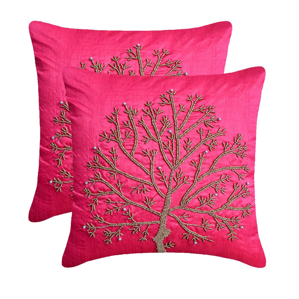 Inspired by nature, the Fuchsia Tree Of Life is a beaded euro sham designed keeping nature and nature lovers in mind. 100% handmade, this silk euro sham designed with art silk dupioni fabric is the picture of elegance.
