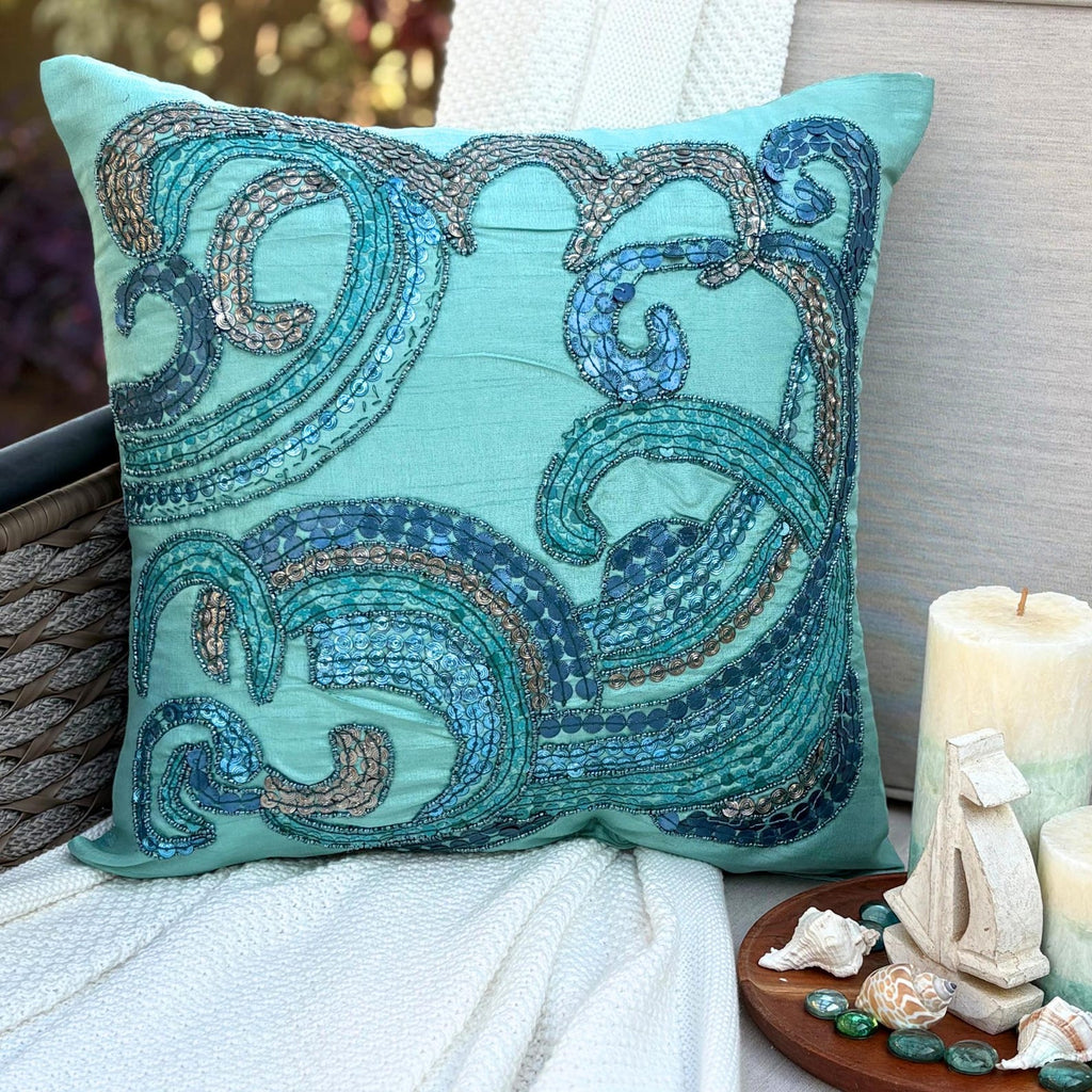 Tides - Aqua Blue Art Silk Throw Cushion Cover